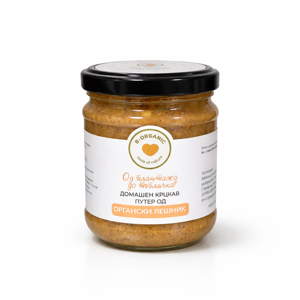 Домашен крцкав путер од органски лешник направен од внимателно одбрани органски лешници, со богат, полн и природен вкус кој се чувствува во секоја лажичка. Подготвен со едноставен и јасен состав, без непотребни додатоци, овој путер ја задржува автентичноста на суровината и вредноста на домашната изработка, создавајќи чувство на доверба и сигурен квалитет. Нежно кремаст, со препознатливи крцкави парчиња лешник, нуди совршено избалансирана текстура и вистинско гурманско уживање. Идеален е за секојдневна употреба, со овошје, на парче леб или како мал момент на задоволство во текот на денот. Природен избор за оние што сакаат искрен вкус, проверено потекло и премиум производ зад кој стои грижа и внимание.