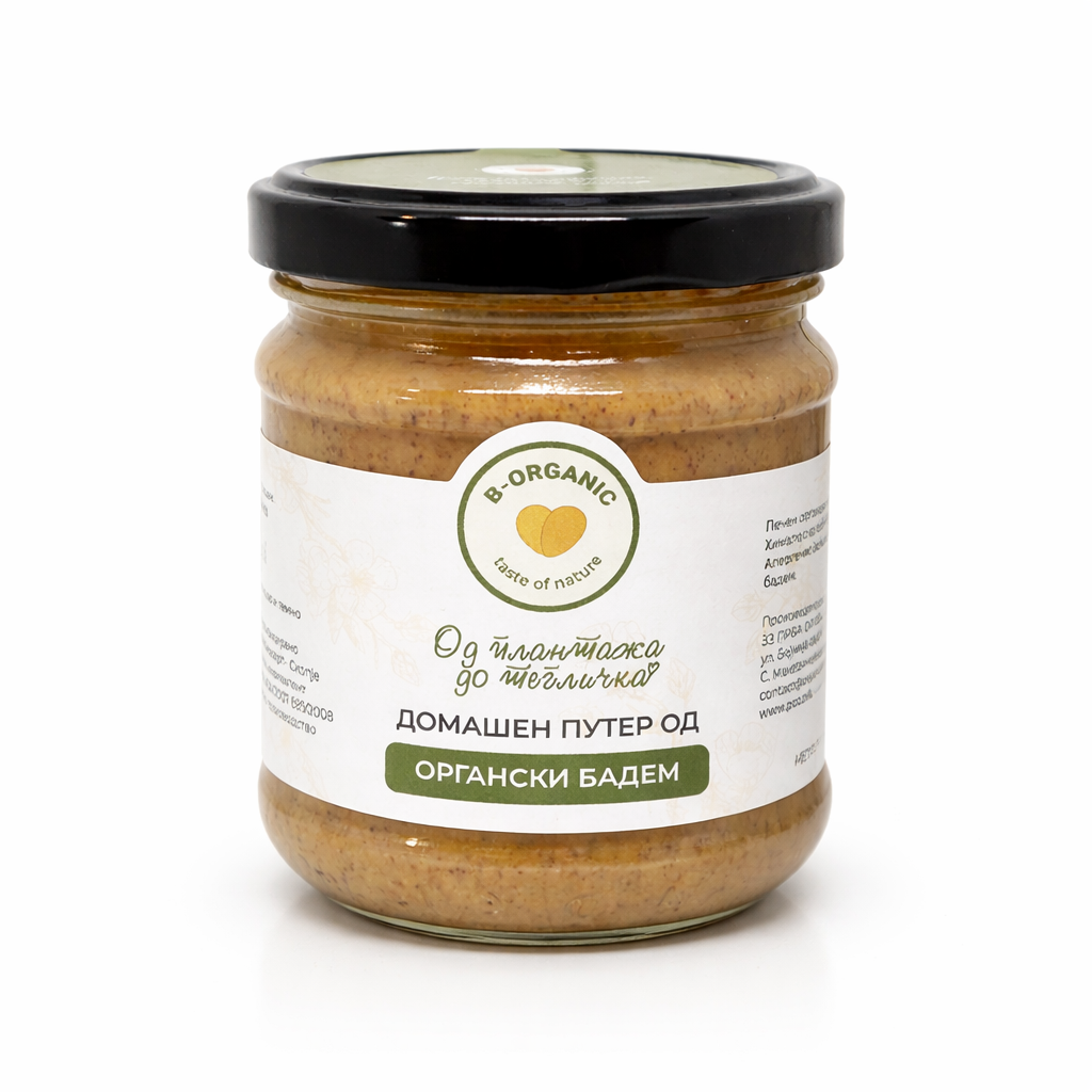 Со уникатен и неодолив вкус под мотото „Oд плантажа до тегличка“ Ви го претставуваме органскиот путер од бадем кој се прави од наш, македнски бадеми.